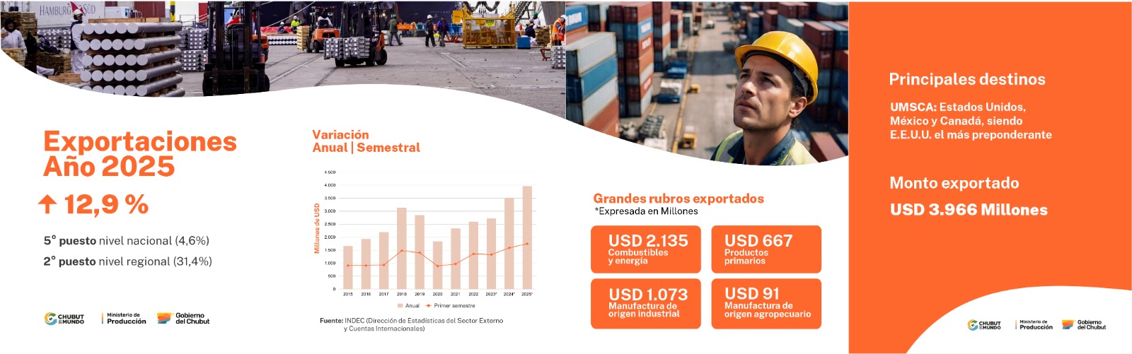 Chubut es una de las principales provincias de la Argentina en materia de Comercio Exterior, posicionándose como la 5° provincia exportadora a nivel Nacional (4.6%) y 2° provincia exportadora a nivel Regional (31.4%).